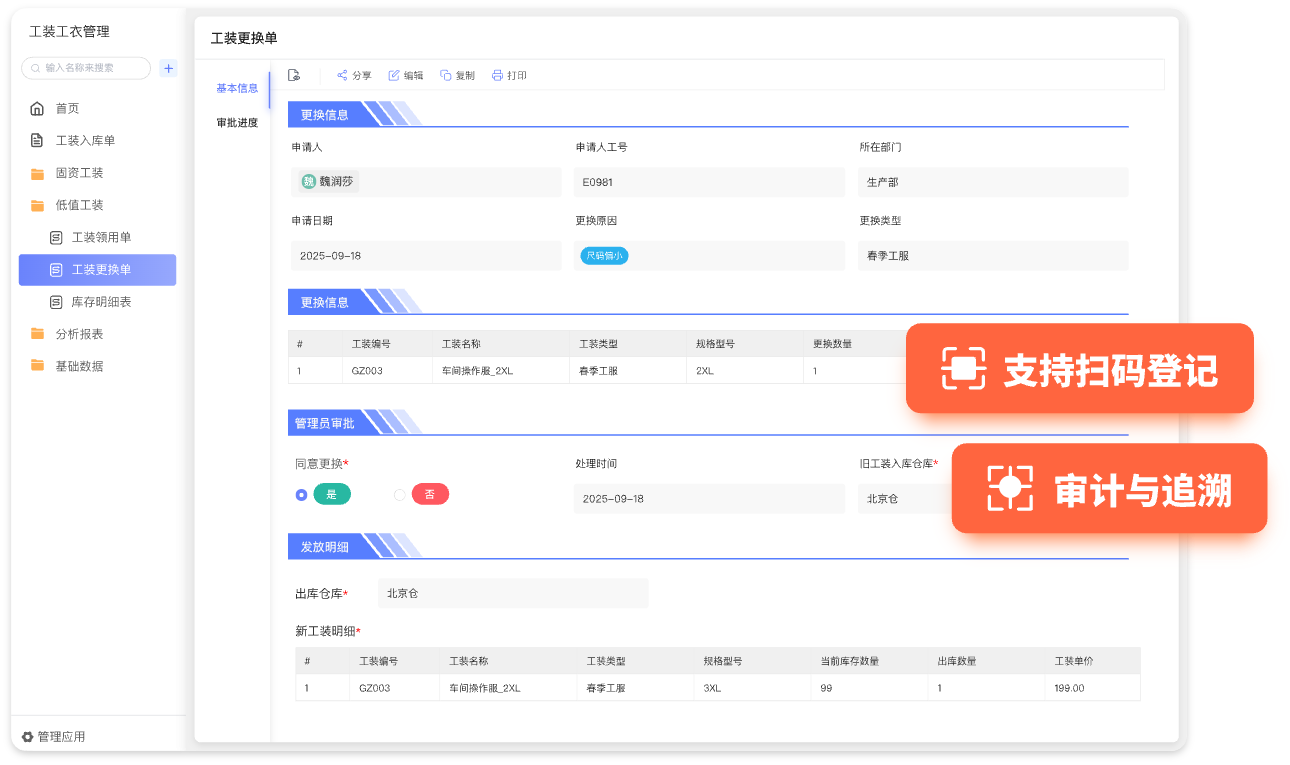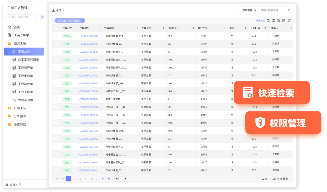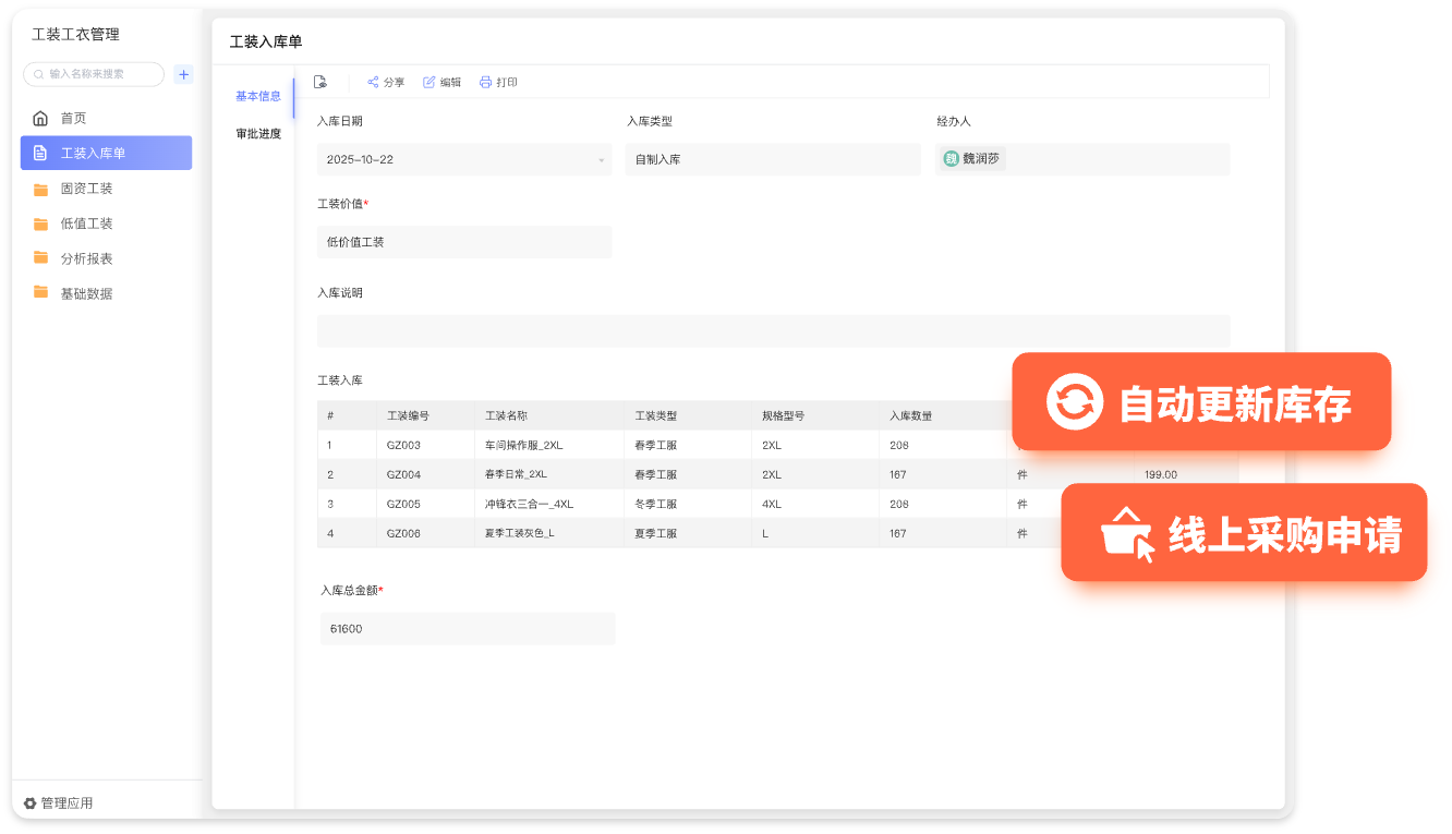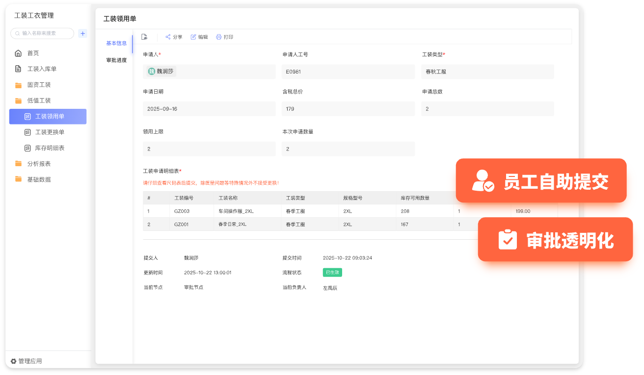 - 维护工装工服档案,记录款式、规格、材质、单价、适用岗位等核心信息,支持快速检索与权限管理