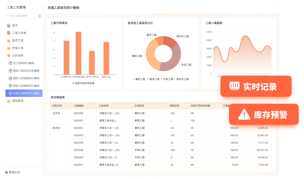- 实时展示工装工服库存余量、库存预警阈值,低于阈值自动提醒补货