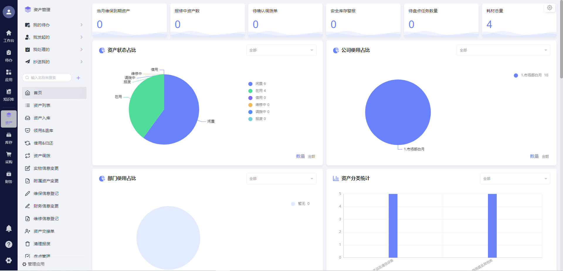 - 数据可视化与报表:内置自动化报表生成功能,支持多维度数据统计分析;搭建数据看板,直观展示资产分布、变动、财务等核心数据,为管理层决策提供精准支撑。