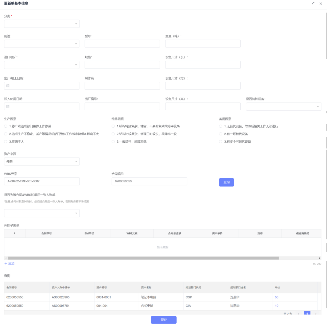 - 资产更新管理:支持选择完全报废且可更新的资产创建新资产,自动带出原资产基本信息并允许编辑修改;成本中心需校验是否同时归属本部与销售公司,需手动选择归属方;审批通过后,系统调用