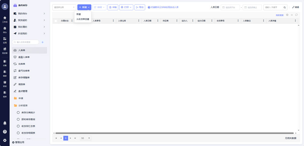 - 库存数据分析可视化:提供即时库存查询、收发存汇总、库存领用统计、分类统计等多维度报表,支持按关键字或特定条件检索,实时掌握备件流入、流出、结存情况,优化采购计划,减少积压浪费。