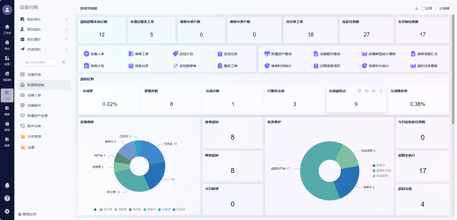 - 运维流程效率低下:设备报修、巡检、保养等流程依赖线下沟通或手工记录,响应滞后;维修过程中因配件短缺导致的停工时间长,维修挂起与启动缺乏规范化管理;巡检与保养计划缺乏个性化适配,执行效果难以监控。