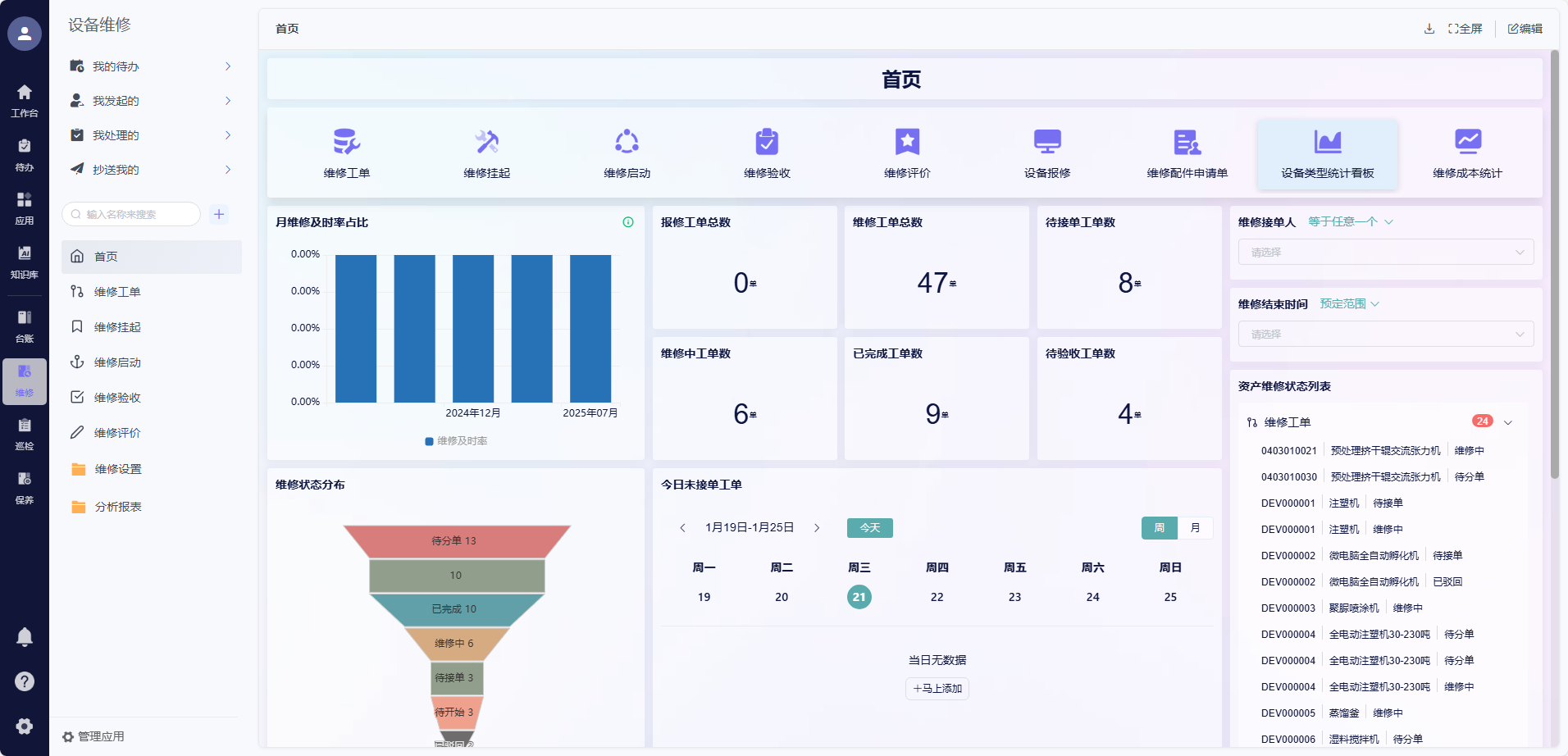 APP)扫码报修,支持拍照上传故障信息;维修工单自动分配至对应班组,维修过程中可根据配件短缺等情况发起维修挂起,待条件具备后启动维修,挂起时间不计入考核;维修完成后,由报修人或验收人进行验收与评价,形成完整闭环;维修数据看板实时展示维修相关数据,便于管理层监控。