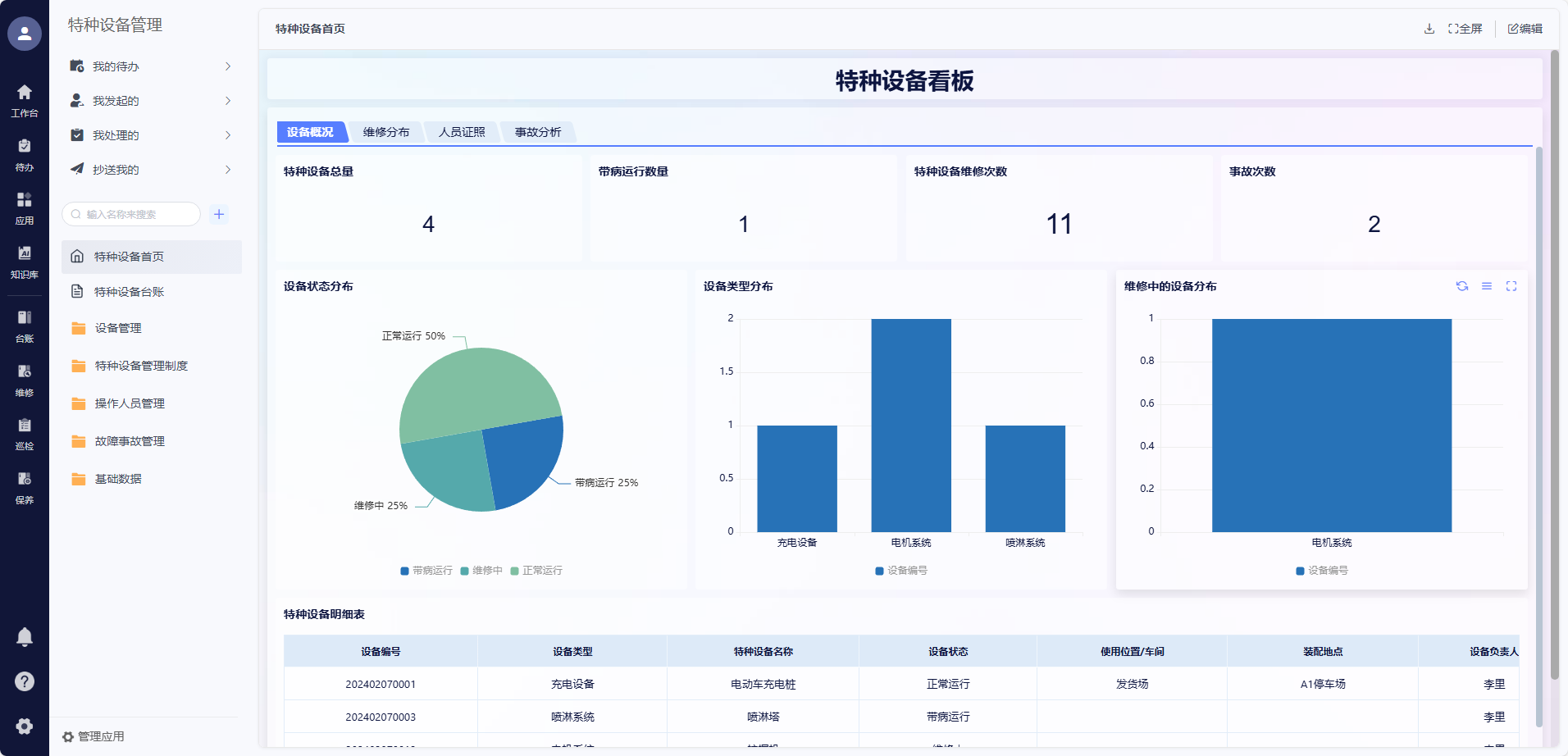 特种设备全流程合规:搭建特种设备专属管理模块,涵盖台账、请购、收货、安装、试机、验收、维修、事故记录、应急预案等全流程;记录操作人员档案与上机申请,确保操作合规;特种设备管理制度与相关文件线上归档,便于合规检查。